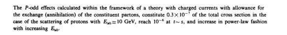 The P-odd effects calculated within the framework of a theory with charged currents with allowance for the exchange (annihilation) of the constituent partons, constitute 0.3X10"7 of the total cross section in the case of the scattering of protons with Elah~\0 GeV, reach 10~6 at f~s, and increase in power-law fashion with increasing jEjab.