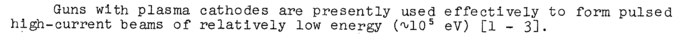 Guns with plasma cathodes are presently used effectively to form pulsed high-current beams of relatively low energy (^105 eV) [1-3].