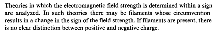 Theories in which the electromagnetic field strength is determined within a sign are analyzed. In such theories there may be filaments whose circumvention results in a change in the sign of the field strength. If filaments are present, there is no clear distinction between positive and negative charge.