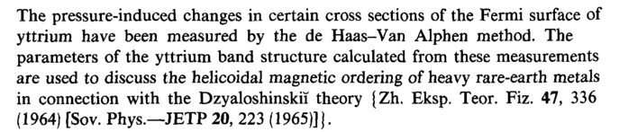 The pressure-induced changes in certain cross sections of the Fermi surface of yttrium have been measured by the de Haas-Van Alphen method. The parameters of the yttrium band structure calculated from these measurements are used to discuss the helicoidal magnetic ordering of heavy rare-earth metals in connection with the Dzyaloshinskii theory (Zh, Eksp. Teor. Fiz. 47, 336 (1964) [Sov. Phys.—JETP 20, 223 (1965)]J.