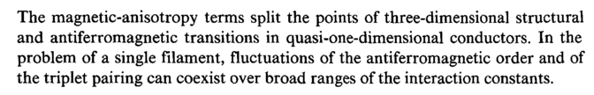 The magnetic-anisotropy terms split the points of three-dimensional structural and antiferromagnetic transitions in quasi-one-dimensional conductors. In the problem of a single filament, fluctuations of the antiferromagnetic order and of the triplet pairing can coexist over broad ranges of the interaction constants.
