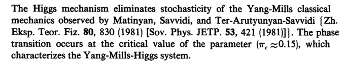 The Higgs mechanism eliminates stochasticity of the Yang-Mills classical mechanics observed by Matinyan, Savvidi, and Ter-Arutyunyan-Savvidi [Zh. Eksp. Teor. Fiz. 80, 830 (1981) [Sov. Phys. JETP. 53, 421 (1981)]). The phase transition occurs at the critical value of the parameter (irc £r0.15), which characterizes the Yang-Mills-Higgs system.