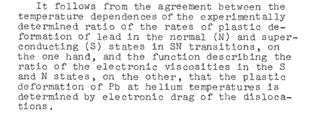 It follows from the agreement between the temperature dependences of the experimentally determined ratio of the rates of plastic deformation of lead in the normal (N) and superconducting (S) states in SN transitions, on the one hand, and the function describing the ratio of the electronic viscosities in the S and N states, on the other, that the plastic deformation of Pb at helium temperatures is determined by electronic drag of the dislocations .