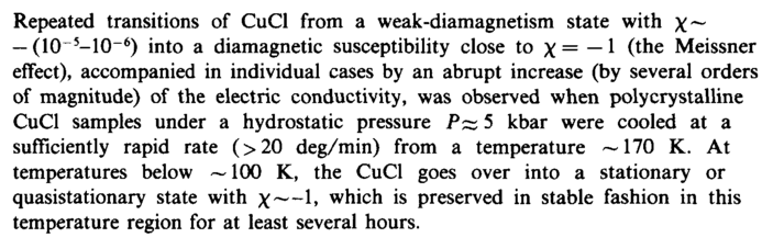 Repeated transitions of CuCl from a weak-diamagnetism state with χ~ — (10~5-10-6) into a diamagnetic susceptibility close to χ= — 1 (the Meissner effect), accompanied in individual cases by an abrupt increase (by several orders of magnitude) of the electric conductivity, was observed when polycrystalline CuCl samples under a hydrostatic pressure P~ 5 kbar were cooled at a sufficiently rapid rate (>20 deg/min) from a temperature ~170 K. At temperatures below —100 K, the CuCl goes over into a stationary or quasistationary state with χ~-1, which is preserved in stable fashion in this temperature region for at least several hours.