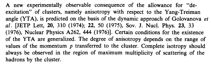 A new experimentally observable consequence of the allowance for "de-excitation" of clusters, namely anisotropy with respect to the Yang-Treiman angle (YTA), is predicted on the basis of the dynamic approach of Golovanova et al. [JETP Lett, 20, 310 (1974); 22, 50 (1975), Sov. J. Nucl. Phys. 23, 33 (1976), Nuclear Physics A262, 444 (1976)]. Certain conditions for the existence of the YTA are generalized. The degree of anisotropy depends on the range of values of the momentum ρ transferred to the cluster. Complete isotropy should always be observed in the region of maximum multiplicity of scattering of the hadrons by the cluster.