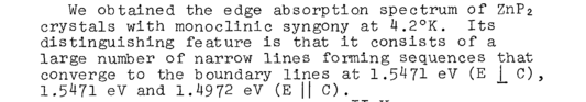 We obtained the edge absorption spectrum of ZnP2 crystals with monoclinic syngony at 4.2°K. Its distinguishing feature is that it consists of a large number of narrow lines forming sequences that converge to the boundary lines at 1.5471 eV (E j_ C) , 1.5471 eV and 1.4972 eV (E || G) .