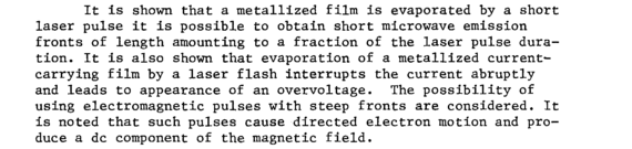 It is shown that a metallized film is evaporated by a short laser pulse it is possible to obtain short microwave emission fronts of length amounting to a fraction of the laser pulse duration. It is also shown that evaporation of a metallized current-carrying film by a laser flash interrupts the current abruptly and leads to appearance of an overvoltage. The possibility of using electromagnetic pulses with steep fronts are considered. It is noted that such pulses cause directed electron motion and produce a dc component of the magnetic field.