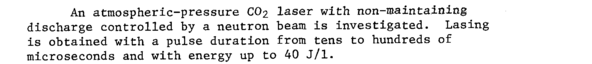 An atmospheric-pressure CO2 laser with non-maintaining discharge controlled by a neutron beam is investigated. Lasing is obtained with a pulse duration from tens to hundreds of microseconds and with energy up to 40 J/1.