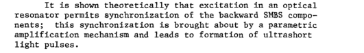 It is shown theoretically that excitation in an optical resonator permits synchronization of the backward SMBS components; this synchronization is brought about by a parametric amplification mechanism and leads to formation of ultrashort light pulses.