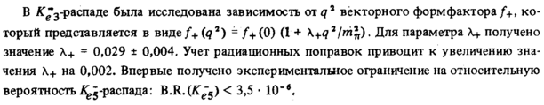 В АГ~3-распаде была исследована зависимость от q2 векторного форм фактора /+, который представляется в виде/+(42) =/+(0) (1+ \+д2/™тг)* Для параметра λ+ получено значение λ+ 0,029 ± 0,004. Учет радиационных поправок приводит к увеличению значения \+ на 0,002. Впервые получено экспериментальное ограничение на относительную вероятность^5-распада: Ъ.К.(К~5) < 3,5 · 10"*,