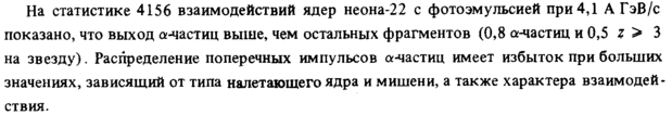 На статистике 4156 взаимодействий ядер неона-22 с фотоэмульсией при 4,1 А ГэВ/с показано, что выход α-частиц выше, чем остальных фрагментов (0,8 а-частиц и 0,5 ζ > 3 на звезду). Распределение поперечных импульсов α-частиц имеет избыток при больших значениях, зависящий от типа налетающего ядра и мишени, а также характера взаимодействия.