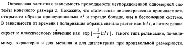 Определена частотная зависимость проводимости неупорядоченной одномерной системы конечного размера ζ. Показано, что статическая диэлектрическая проницаемость открытого образца пропорциональна ζ2 и гораздо больше, чем в бесконечной системе. В зависимости от времени t поляризация образца сначала растет как ln3f, а потом релак- сирует к классическому значению как ехр [ -— 1η2ί ]. Такого типа релаксация, по-видимому, характерна и для металла и для диэлектрика при произвольной размерности.