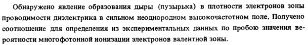 Обнаружено явление образования дыры (пузырька) в плотности электронов зоны проводимости диэлектрика в сильном неоднородном высокочастотном поле. Получено соотношение для определения из экспериментальных данных по пробою значения вероятности многофотонной ионизации электронов валентной зоны.