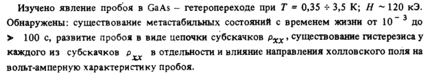 Изучено явление пробоя в GaAs гетеропереходе при Τ ~ 0,35 τ 3,5 К; Я ~ 120 кЭ. Обнаружены: существование метастабильных состояний с временем жизни от 10 до > 100 с, развитие пробоя в виде цепочки субскачков рхх > существование гистерезиса у каждого из субскачков р^ в отдельности и влияние направления холловского поля на вольт-амперную характеристику пробоя.