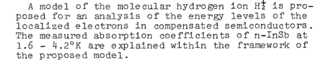 A model of the molecular hydrogen ion Hi is proposed for an analysis of the energy levels of the localized electrons in compensated semiconductors. The measured absorption coefficients of n-InSb at 1.6 4.2°K are explained within the framework of the proposed model.