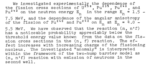 We investigated experimentally the dependence of the fission cross sections of U2^8, Pu23', Pu2"0, and Pu21*2 on the neutron energy Ε in the range En = 1.5 7.5 MeV, and the dependence of the angular anisotropy of the fission of Pu"0 and Pu2"2 on En at En = 4 .0 5.5 MeV. We have observed that the reaction (n, n'f) has a noticeable probability appreciably below the threshold energy value known from the data on the fission cross sections in the (n, f) reaction. The effect increases with increasing charge of the fissioning nucleus. The investigated "anomaly" is interpreted within the framework of the two-hump barrier model as (n, n'f) reaction with emission of neutrons in the second well.