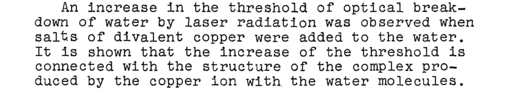An increase in the threshold of optical breakdown of water by laser radiation was observed when salts of divalent copper were added to the water. It is shown that the increase of the threshold is connected with the structure of the complex produced by the copper ion with, the water molecules.