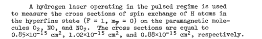 A hydrogen laser operating in the pulsed regime is used to measure the cross sections of spin exchange of Η atoms in the hyper fine state (F = 1, m-p = 0) on the paramagnetic molecules C>29 TO, and ΝΟ2ž The cross sections are equal to 0.85è1óç15 cm2, 1.02x10"15 cm2, and 0.88*10"15 cm2, respectively.
