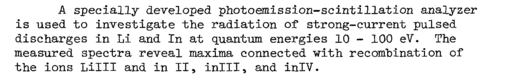 A specially developed photoemission-scintillation analyzer is used to investigate the radiation of strong-current pulsed discharges in Li and In at quantum energies 10 100 eV. The measured spectra reveal maxima connected with recombination of the ions Lilll and in II, inlll, and inlV.