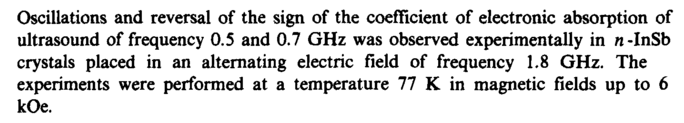 Oscillations and reversal of the sign of the coefficient of electronic absorption of ultrasound of frequency 0.5 and 0.7 GHz was observed experimentally in n-InSb crystals placed in an alternating electric field of frequency 1.8 GHz. The experiments were performed at a temperature 77 К in magnetic fields up to 6 kOe.