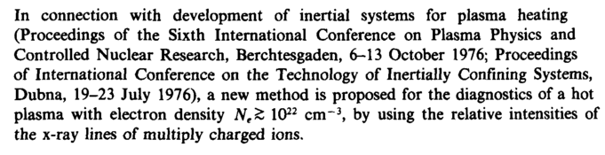 In connection with development of inertial systems for plasma heating (Proceedings of the Sixth International Conference on Plasma Physics and Controlled Nuclear Research, Berchtesgaden, 6-13 October 1976; Proceedings of International Conference on the Technology of Inertially Confining Systems, Dubna, 19-23 July 1976), a new method is proposed for the diagnostics of a hot plasma with electron density NeZ 1022 cm"3, by using the relative intensities of the x-ray lines of multiply charged ions.