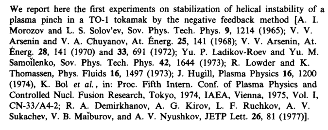 We report here the first experiments on stabilization of helical instability of a plasma pinch in a TO-1 tokamak by the negative feedback method [A. I. Morozov and L. S. Solov'ev, Sov. Phys. Tech. Phys. 9, 1214 (1965); V. V. Arsenin and V. A. Chuyanov, At. Ёпег^ 25, 141 (1968); V. V. Arsenin, At. £nerg. 28, 141 (1970) and 33, 691 (1972); Yu. P. Ladikov-Roev and Yu. M. Samoilenko, Sov. Phys. Tech. Phys. 42, 1644 (1973); R. Lowder and K. Thomassen, Phys. Fluids 16, 1497 (1973); J. Hugill, Plasma Physics 16, 1200 (1974), K. Bol et al., in: Proc. Fifth Intern. Conf. of Plasma Physics and Controlled Nucl. Fusion Research, Tokyo, 1974, IAEA, Vienna, 1975, Vol. I, CN-33/A4-2; R. A. Demirkhanov, A. G. Kirov, L. F. Ruchkov, Α. V. Sukachev, V. B. Maiburov, and Α. V. Nyushkov, JETP Lett. 26, 81 (1977)].