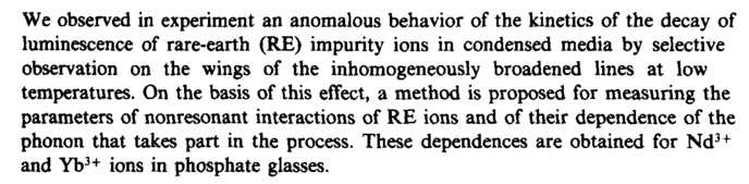 We observed in experiment an anomalous behavior of the kinetics of the decay of luminescence of rare-earth (RE) impurity ions in condensed media by selective observation on the wings of the inhomogeneously broadened lines at low temperatures. On the basis of this effect, a method is proposed for measuring the parameters of nonresonant interactions of RE ions and of their dependence of the phonon that takes part in the process. These dependences are obtained for Nd3+ and Yb3+ ions in phosphate glasses.