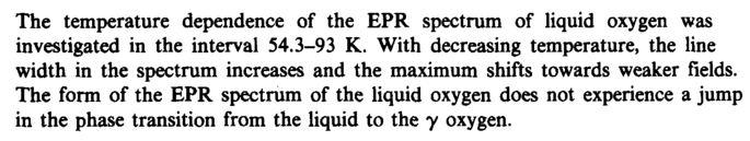 The temperature dependence of the EPR spectrum of liquid oxygen was investigated in the interval 54.3-93 K. With decreasing temperature, the line width in the spectrum increases and the maximum shifts towards weaker fields. The form of the EPR spectrum of the liquid oxygen does not experience a jump in the phase transition from the liquid to the у oxygen.