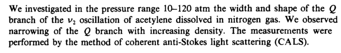 We investigated in the pressure range 10-120 atm the width and shape of the Q branch of the v2 oscillation of acetylene dissolved in nitrogen gas. We observed narrowing of the Q branch with increasing density. The measurements were performed by the method of coherent anti-Stokes light scattering (CALS).