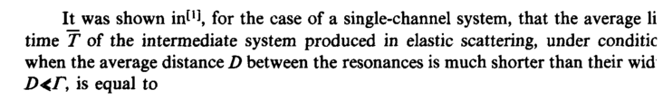 It was shown in[1], for the case of a single-channel system, that the average li time Τ of the intermediate system produced in elastic scattering, under conditic when the average distance D between the resonances is much shorter than their wid Ώ<Γ, is equal to