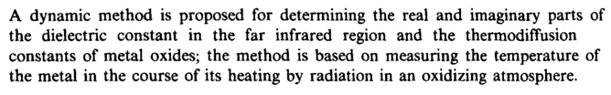 A dynamic method is proposed for determining the real and imaginary parts of the dielectric constant in the far infrared region and the thermodiffusion constants of metal oxides; the method is based on measuring the temperature of the metal in the course of its heating by radiation in an oxidizing atmosphere.