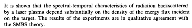 It is shown that the spectral-temporal characteristics of radiation backscattered by a laser plasma depend substantially on the density of the energy flux incident on the target. The results of the experiments are in qualitative agreement with the SMBS theory.