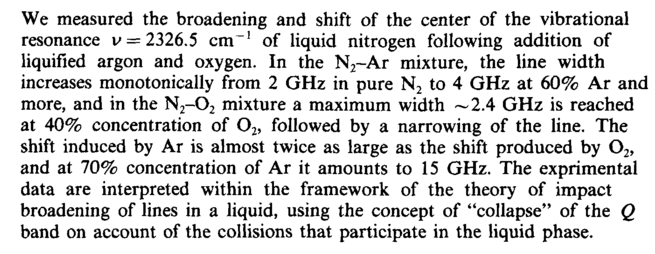 We measured the broadening and shift of the center of the vibrational resonance ν = 2326.5 cm-1 of liquid nitrogen following addition of liquified argon and oxygen. In the N2-Ar mixture, the line width increases monotonically from 2 GHz in pure N2 to 4 GHz at 60% Ar and more, and in the N2-02 mixture a maximum width ~2.4 GHz is reached at 40% concentration of 02, followed by a narrowing of the line. The shift induced by Ar is almost twice as large as the shift produced by 02, and at 70% concentration of Ar it amounts to 15 GHz. The exprimental data are interpreted within the framework of the theory of impact broadening of lines in a liquid, using the concept of "collapse" of the Q band on account of the collisions that participate in the liquid phase.