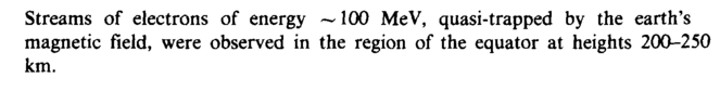 Streams of electrons of energy ~100 MeV, quasi-trapped by the earth's magnetic field, were observed in the region of the equator at heights 200-250 km.