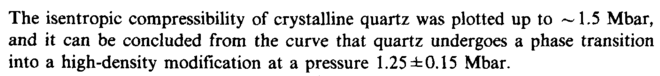 The isentropic compressibility of crystalline quartz was plotted up to —1.5 Mbar, and it can be concluded from the curve that quartz undergoes a phase transition into a high-density modification at a pressure 1.25 ±0.15 Mbar.