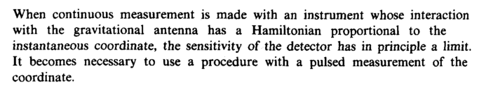 When continuous measurement is made with an instrument whose interaction with the gravitational antenna has a Hamiltonian proportional to the instantaneous coordinate, the sensitivity of the detector has in principle a limit. It becomes necessary to use a procedure with a pulsed measurement of the coordinate.