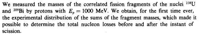 We measured the masses of the correlated fission fragments of the nuclei 238U and 209Bi by protons with Ep = 1000 MeV. We obtain, for the first time ever, the experimental distribution of the sums of the fragment masses, which made it possible to determine the total nucleon losses before and after the instant of scission.