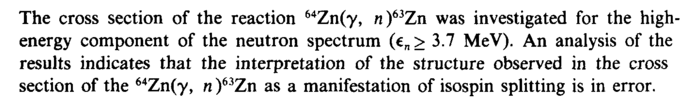 The cross section of the reaction 64Ζη(γ, n)63Zn was investigated for the high-energy component of the neutron spectrum (en > 3.7 MeV). An analysis of the results indicates that the interpretation of the structure observed in the cross section of the 64Ζη(γ, η )63Zn as a manifestation of isospin splitting is in error.