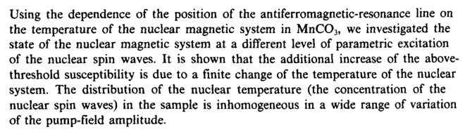 Using the dependence of the position of the antiferromagnetic-resonance line on the temperature of the nuclear magnetic system in MnC03, we investigated the state of the nuclear magnetic system at a different level of parametric excitation of the nuclear spin waves. It is shown that the additional increase of the above-threshold susceptibility is due to a finite change of the temperature of the nuclear system. The distribution of the nuclear temperature (the concentration of the nuclear spin waves) in the sample is inhomogeneous in a wide range of variation of the pump-field amplitude.