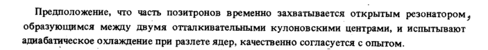 Предположение, что часть позитронов временно захватывается открытым резонатором образующимся между двумя отталкивательными кулоновскими центрами, и испытывают адиабатическое охлаждение при разлете ядер, качественно согласуется с опытом.