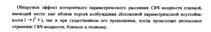 Обнаружен эффект когерентного параметрического рассеяния СВЧ мощности плазмой, имеющий место как вблизи порога возбуждения абсолютной параметрической неустойчивости / -*·/ +s, так и при существенном его превышении, когда происходит аномальное отражение СВЧ мощности, близкое к полному.