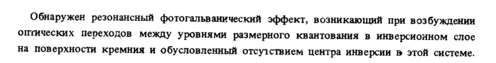 Обнаружен резонансный фотогальванический эффект, возникающий при возбуждении оптических переходов между уровнями размерного квантования в инверсионном слое на поверхности кремния и обусловленный отсутствием центра инверсии в этой системе.