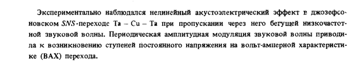 Экспериментально наблюдался нелинейный акустоэлектрический эффект в джозефсо-новском SjVS-nepexofle Та Си Та при пропускании через него бегущей низкочастотной звуковой волны. Периодическая амплитудная модуляция звуковой волны приводила к возникновению ступеней постоянного напряжения на вольт-амперной характеристике (ΒΑΧ) перехода.