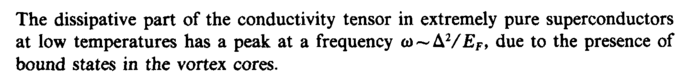 The dissipative part of the conductivity tensor in extremely pure superconductors at low temperatures has a peak at a frequency o>~AV£f, due to the presence of bound states in the vortex cores.