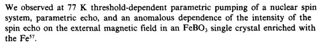 We observed at 77 К threshold-dependent parametric pumping of a nuclear spin system, parametric echo, and an anomalous dependence of the intensity of the spin echo on the external magnetic field in an FeBOj single crystal enriched with the Fe57.