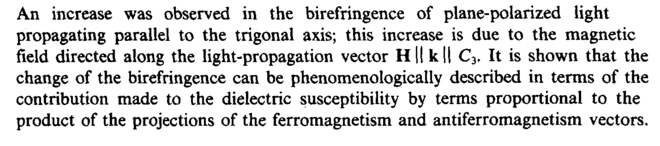 An increase was observed in the birefringence of plane-polarized light propagating parallel to the trigonal axis; this increase is due to the magnetic field directed along the light-propagation vector Η II к II C3. It is shown that the change of the birefringence can be phenomenologically described in terms of the contribution made to the dielectric susceptibility by terms proportional to the product of the projections of the ferromagnetism and antiferromagnetism vectors.