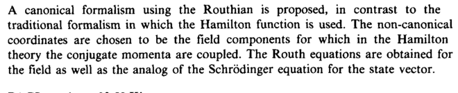 A canonical formalism using the Routhian is proposed, in contrast to the traditional formalism in which the Hamilton function is used. The non-canonical coordinates are chosen to be the field components for which in the Hamilton theory the conjugate momenta are coupled. The Routh equations are obtained for the field as well as the analog of the Schrodinger equation for the state vector.