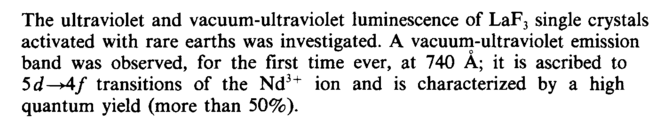 The ultraviolet and vacuum-ultraviolet luminescence of LaF3 single crystals activated with rare earths was investigated. A vacuum-ultraviolet emission band was observed, for the first time ever, at 740 A; it is ascribed to 5d-+4f transitions of the Nd3+ ion and is characterized by a high quantum yield (more than 50%).