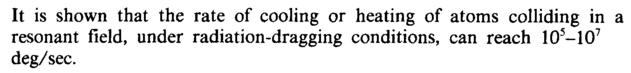 It is shown that the rate of cooling or heating of atoms colliding in a resonant field, under radiation-dragging conditions, can reach 10