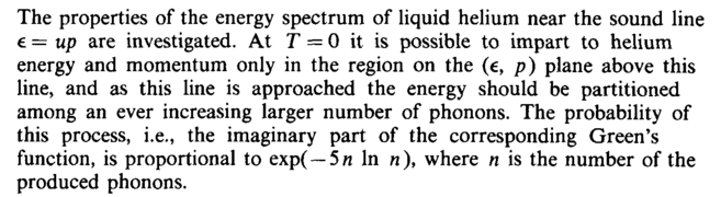 The properties of the energy spectrum of liquid helium near the sound line € = up are investigated. At Τ = 0 it is possible to impart to helium energy and momentum only in the region on the (e, p) plane above this line, and as this line is approached the energy should be partitioned among an ever increasing larger number of phonons. The probability of this process, i.e., the imaginary part of the corresponding Green's function, is proportional to exp(—5и In n), where η is the number of the produced phonons.